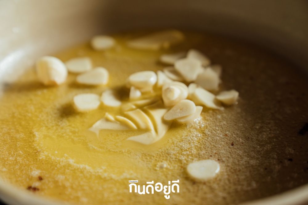 จากนั้นใส่เนยและกระเทียมลงในกระทะ