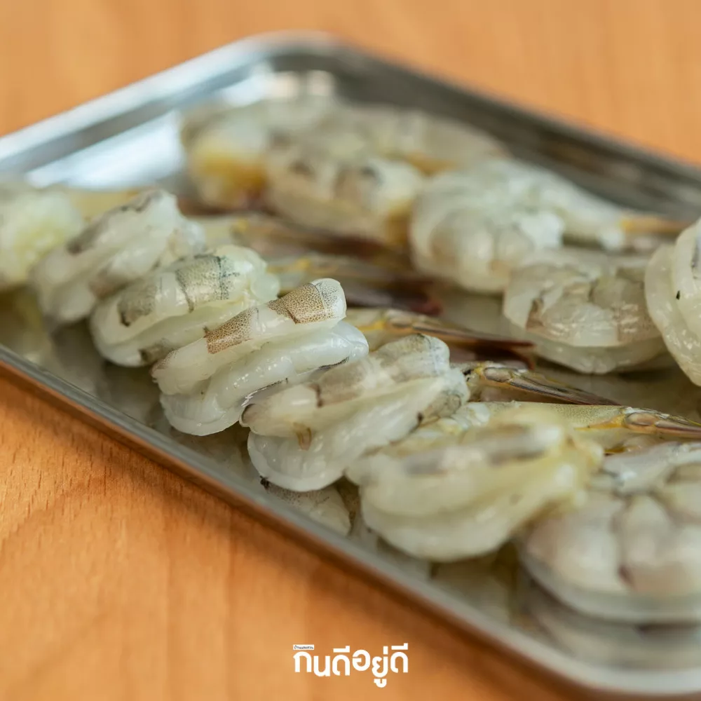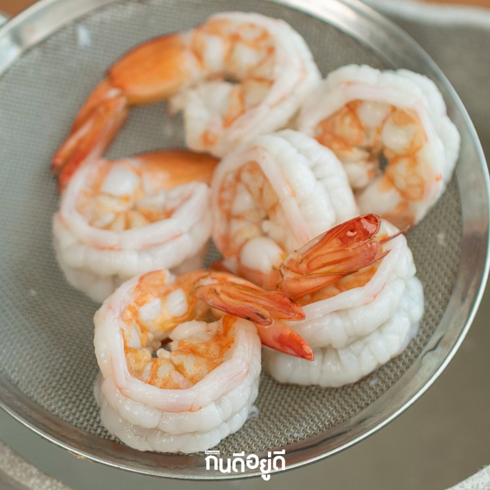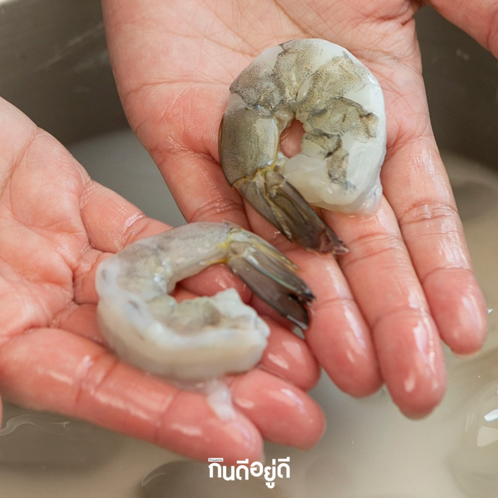แกะเปลือกกุ้งออกให้หมด จากนั้นเอาเส้นดำที่บริเวณหลังออกทุกตัวเลยนะ ส่วนเปลือกกุ้งที่แกะไว้ สามารถนำไปต้มทำเป็นน้ำสต๊อกกุ้งเก็บไว้ใช้ต่อในเมนูอื่นได้อีกด้วยค่ะ