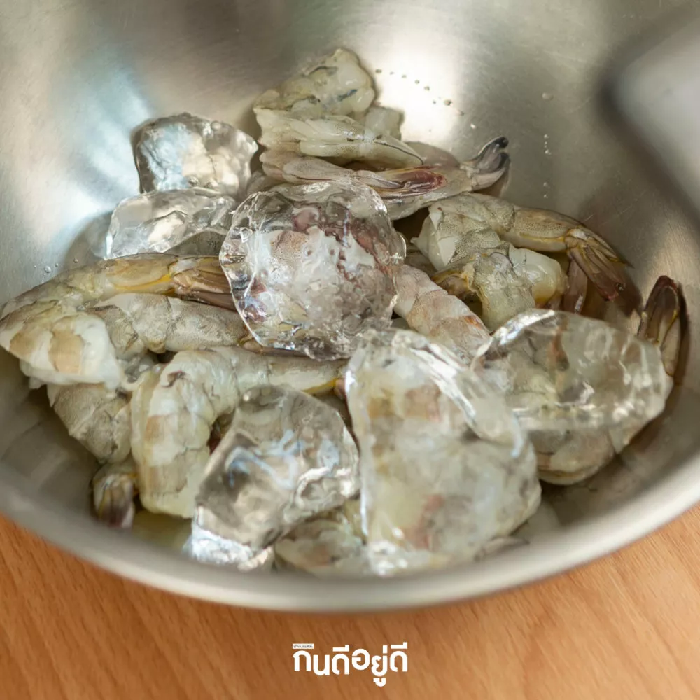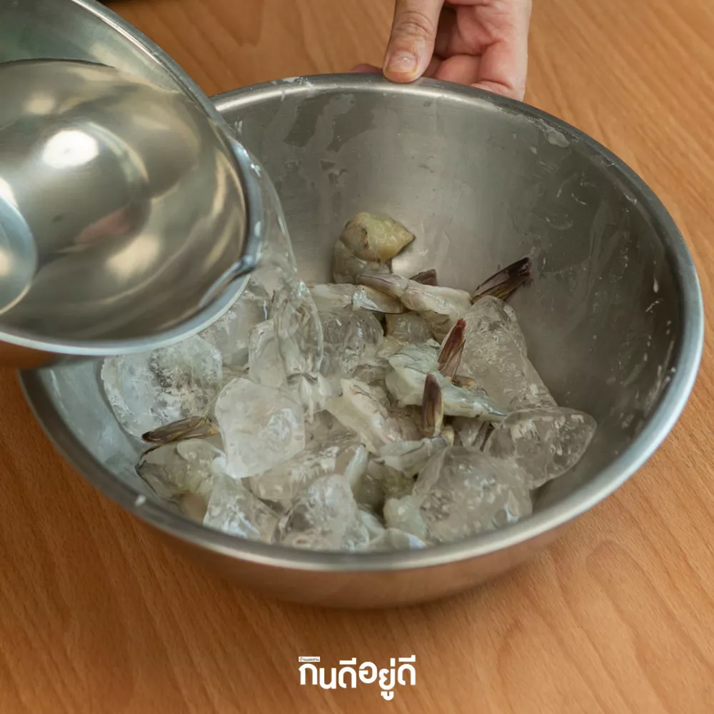 เตรียมภาชนะสะอาด 1 ใบ ใส่กุ้งลงไปแล้วตามด้วยน้ำแข็ง
