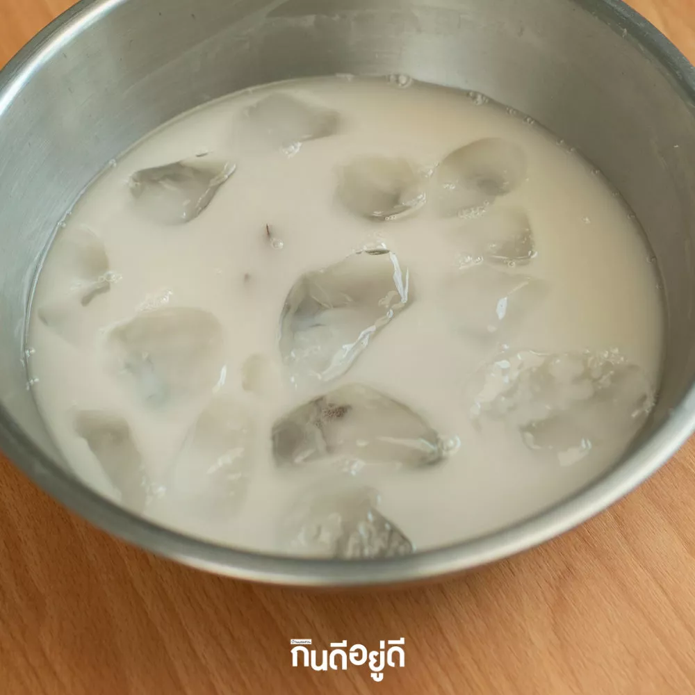 จากนั้นเติมน้ำสะอาดเย็นตามลงไป คลุกเคล้าครั้งสุดท้ายเบา ๆ
