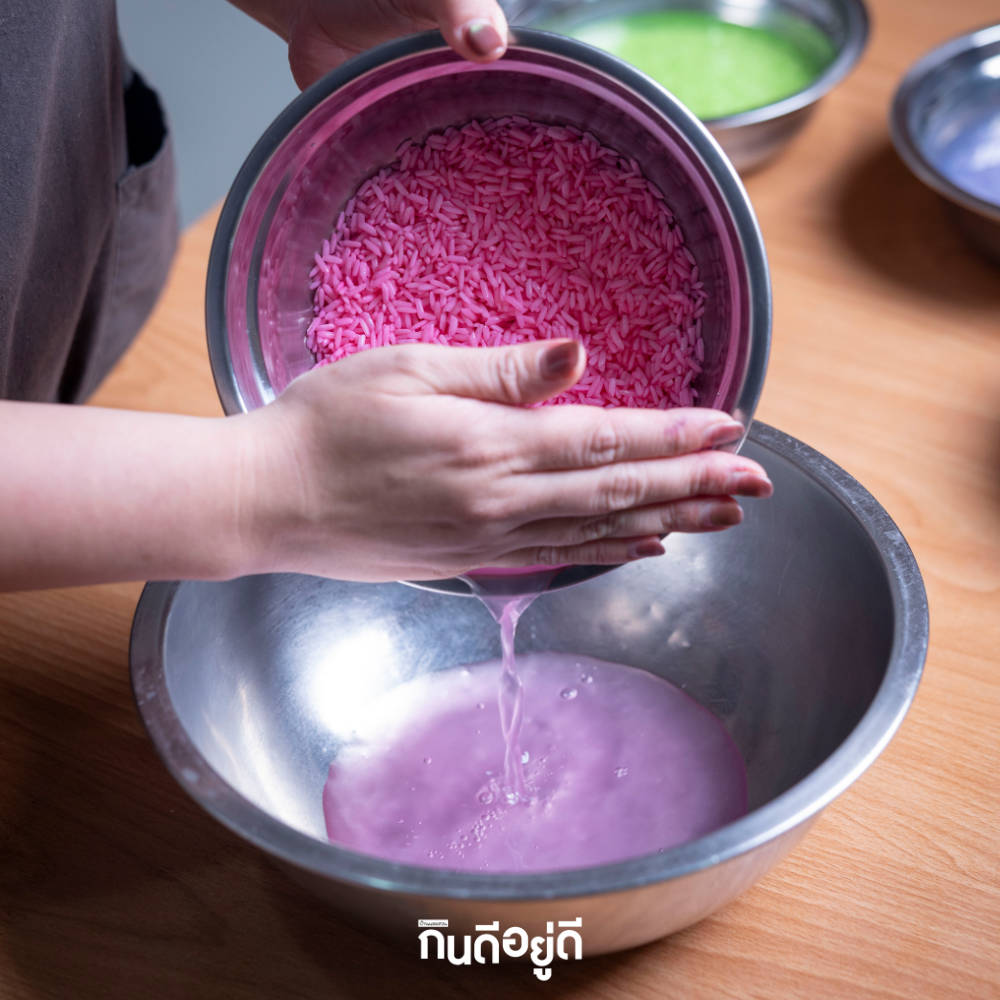 - เมื่อครบกำหนดแล้ว รินน้ำที่แช่ข้าวออกให้ครบทุกสีเลยนะคะ