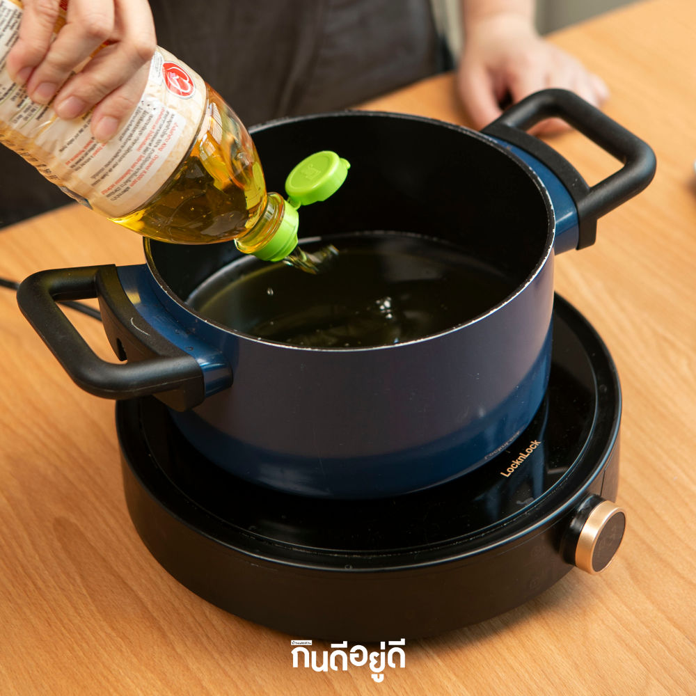เปิดไฟกลาง ตั้งหม้อ เทน้ำมันลงไปได้เลย การทอดแบบนี้ต้องใช้น้ำมันเยอะ เทหมดขวดไปเลยนะคะ ไม่ต้องเสียดาย ยิ่งน้ำมันเยอะ ยิ่งทอดกรอบ