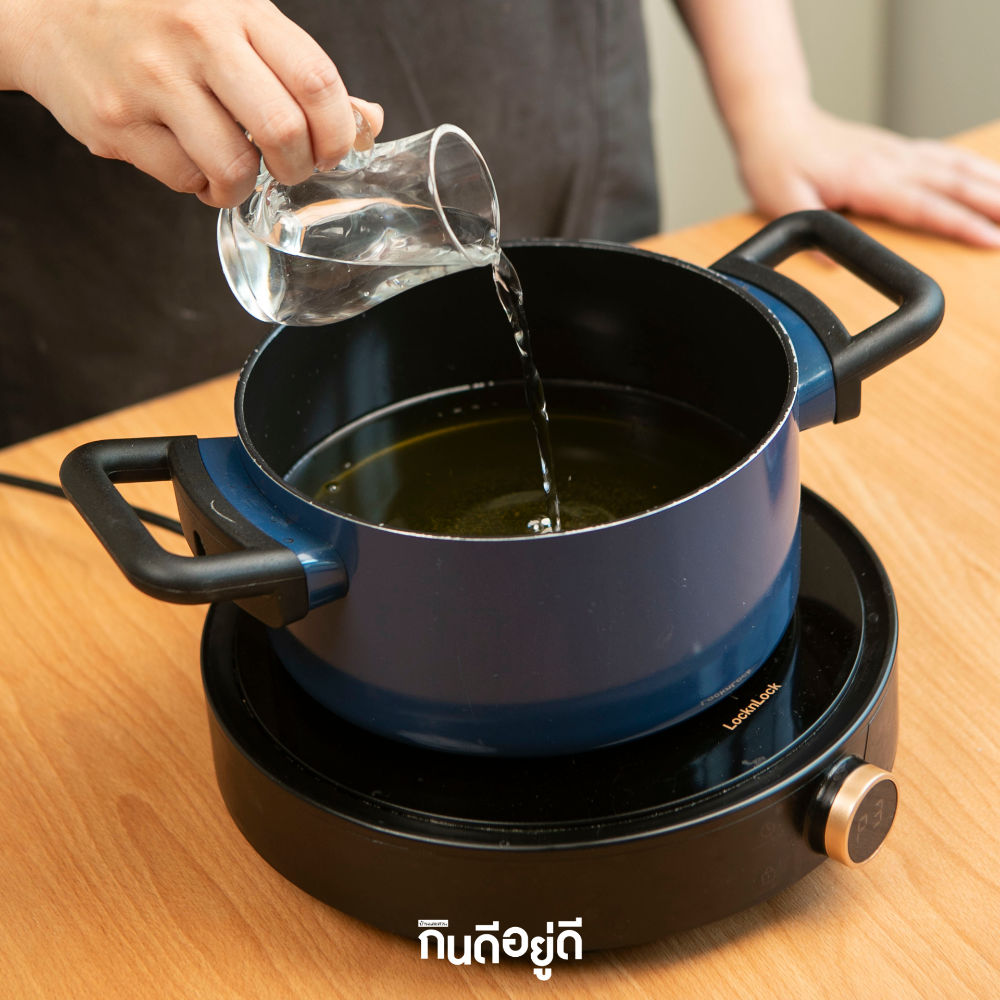 จากนั้นใส่น้ำส้มสายชูลงไปนิดหน่อย เพื่อไล่ความชื้นในไส้กรอก