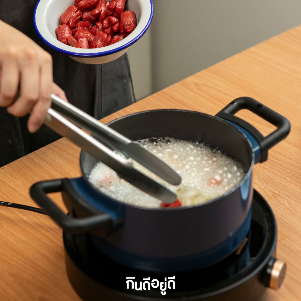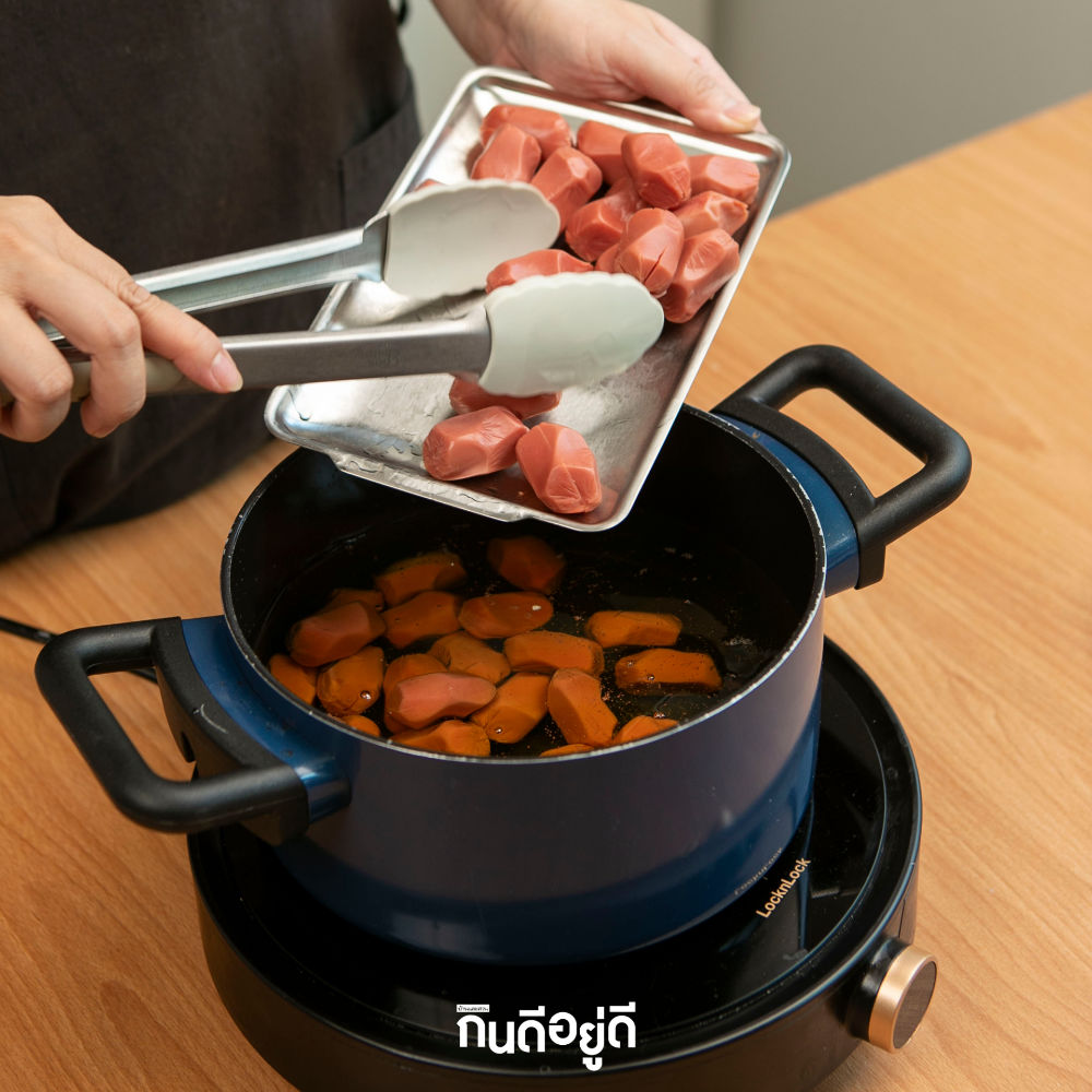 ไม่ต้องรอให้น้ำมันร้อนจนมีควัน แค่น้ำมันขึ้นเป็นพรายก็พอแล้วค่ะ จากนั้นก็นำไส้กรอกลงหม้อไปได้เลย ในช่วงแรกไส้กรอกอาจจะนิ่งหน่อย หมั่นคนเรื่อย ๆ เพื่อไม่ให้ไส้กรอกติดก้นหม้อ