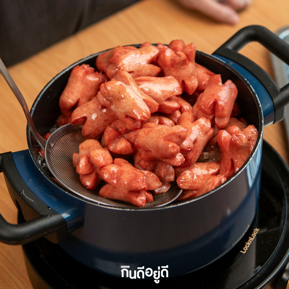 ตักขึ้นพักไว้ 5 นาที ไส้กรอกแดงที่เคยพอง ๆ ก็จะค่อย ๆ เหี่ยวลงแบบนี้ไม่ต้องตกใจนะคะ ส่วนเตาก็ปิดไฟไว้ ตรวจเช็คน้ำมันในหม้อ ถ้ามีเศษไส้กรอกที่หลุดอยู่ ให้ช้อนออก
