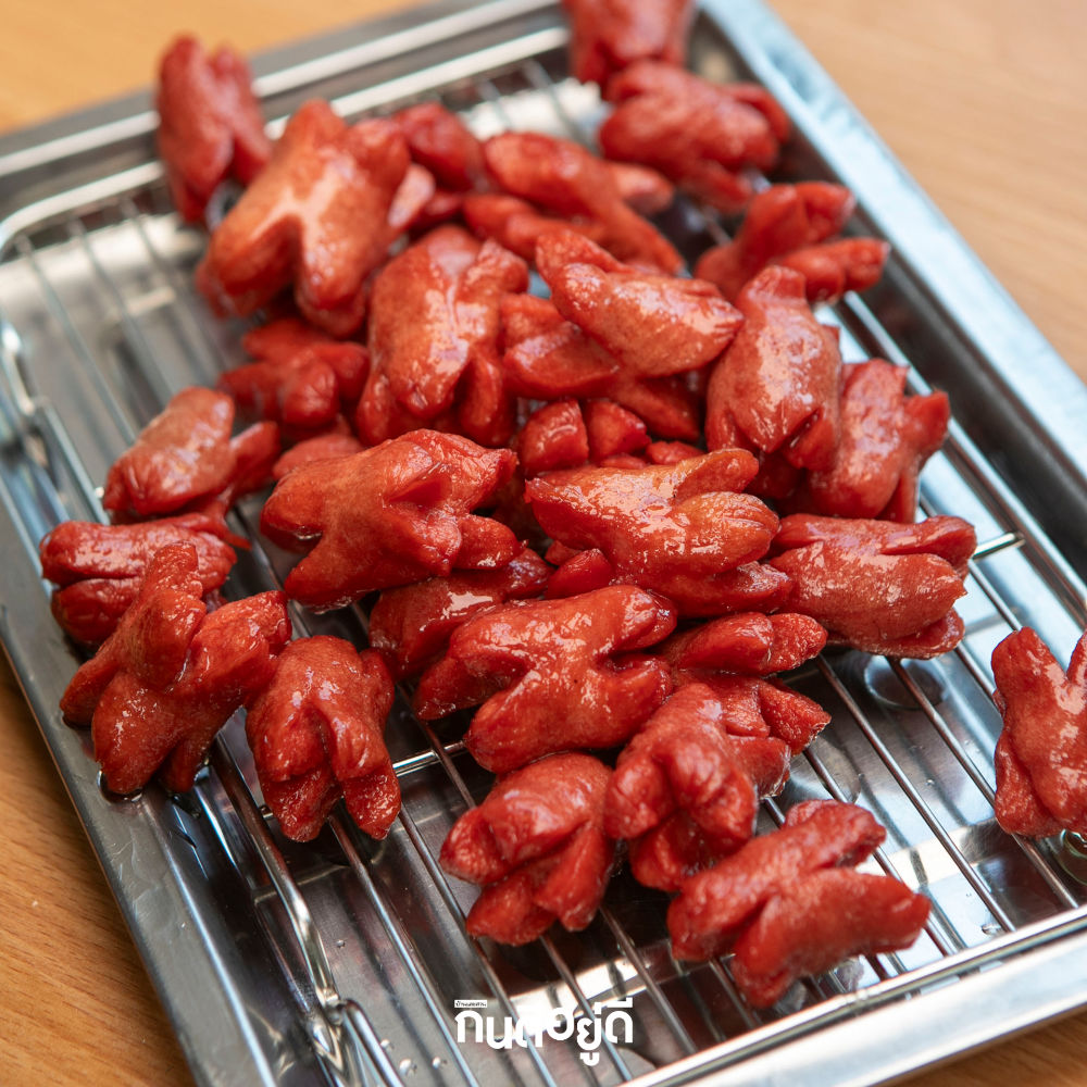 คน ๆ ทอด ๆ วนไปเรื่อย ๆ ใช้เวลาประมาณ 20 นาที โดยใช้ไฟกลางไปเรื่อย ๆ พอไส้กรอกเริ่มพองแบบนี้ ครบกำหนดเวลาแล้วก็ตักขึ้น ตอนนี้ไส้กรอกแดงของเรายังไม่กรอบนะคะ