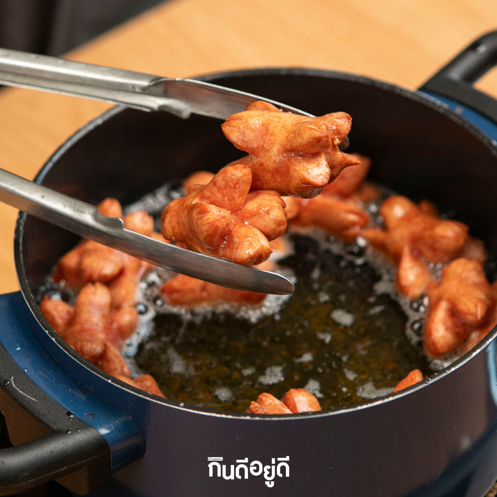 ทอดไปเรื่อย ๆ เมื่อไส้กรอกพองแล้ว ก็จะลอยตุ๊ปป่องขึ้นมาบนน้ำมันแบบนี้เลย ตักขึ้น พักให้สะเด็ดน้ำมันดี ก็พร้อมเสิร์ฟ