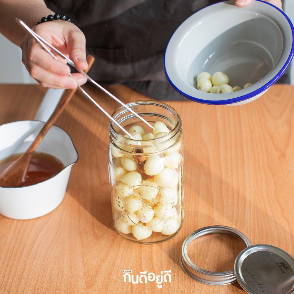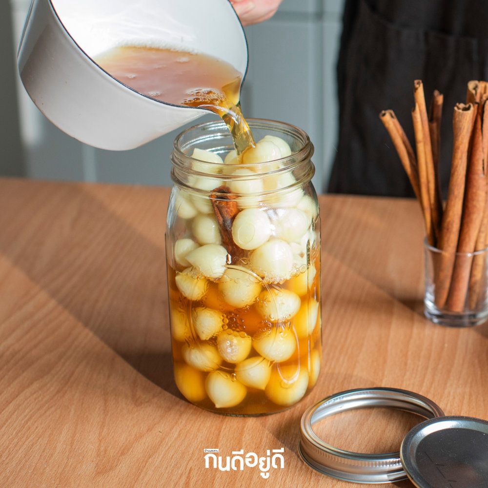 7. เมื่อน้ำดองเย็นแล้วเทลงโหลจนท่วมกระเทียมโทน