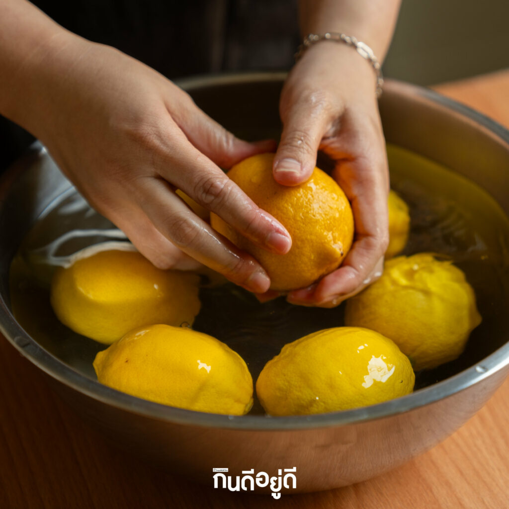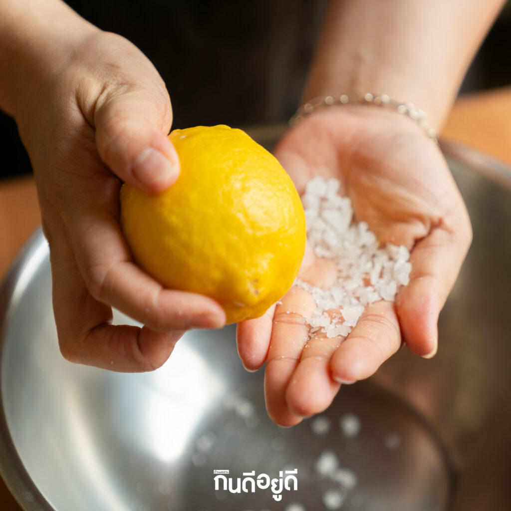 เปลือกของเลมอนเจออะไรมาบ้างก็ไม่รู้ก่อนเราจะเอามาดองใส่โหลต้องล้างให้สะอาดเอี่ยม โดยการใช้เกลือถูเปลือกรอบ ๆ เพื่อล้างเอาแว็กซ์เคลือบผิว รวมไปถึงสิ่งสกปรกที่ฝังตัวอยู่ออกไป
