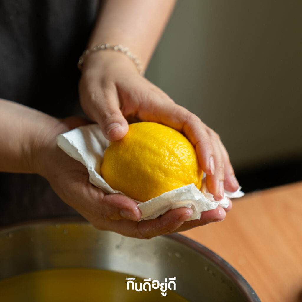 ใช้กระดาษทิชชู่สำหรับทำครัว หรือ ผ้า ก็ได้ค่ะตามสะดวก ซับเลมอนให้แห้งหมดทุกลูก