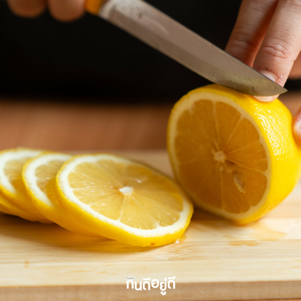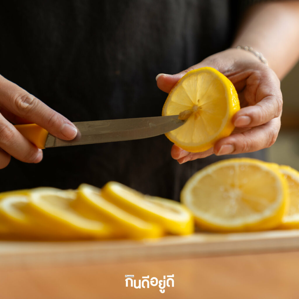 เมื่อหั่นเลมอนเป็นแว่นไว้จนหมดแล้ว อย่าลืมเอาเม็ดออกด้วยนะคะ
