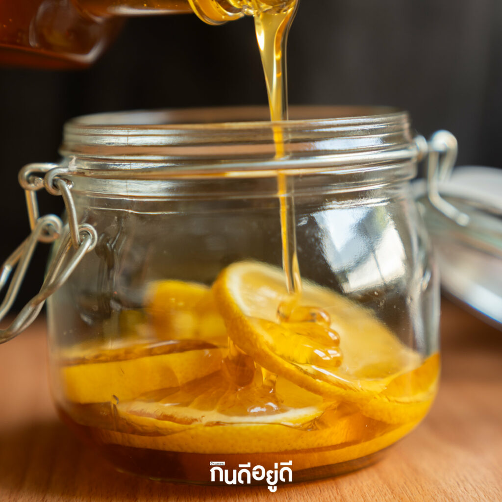 จัดการหาโหลแก้ว ลวกทำความสะอาดให้เรียบร้อย เช็ดจนแห้งสนิท จากนั้นก็เรียงเลมอนที่หั่นแว่นเตรียมไว้ลงไปประมาณ 4 – 5 ชิ้นพอให้มีความหนาแล้วเทน้ำผึ้งตามไปได้เลยค่ะ