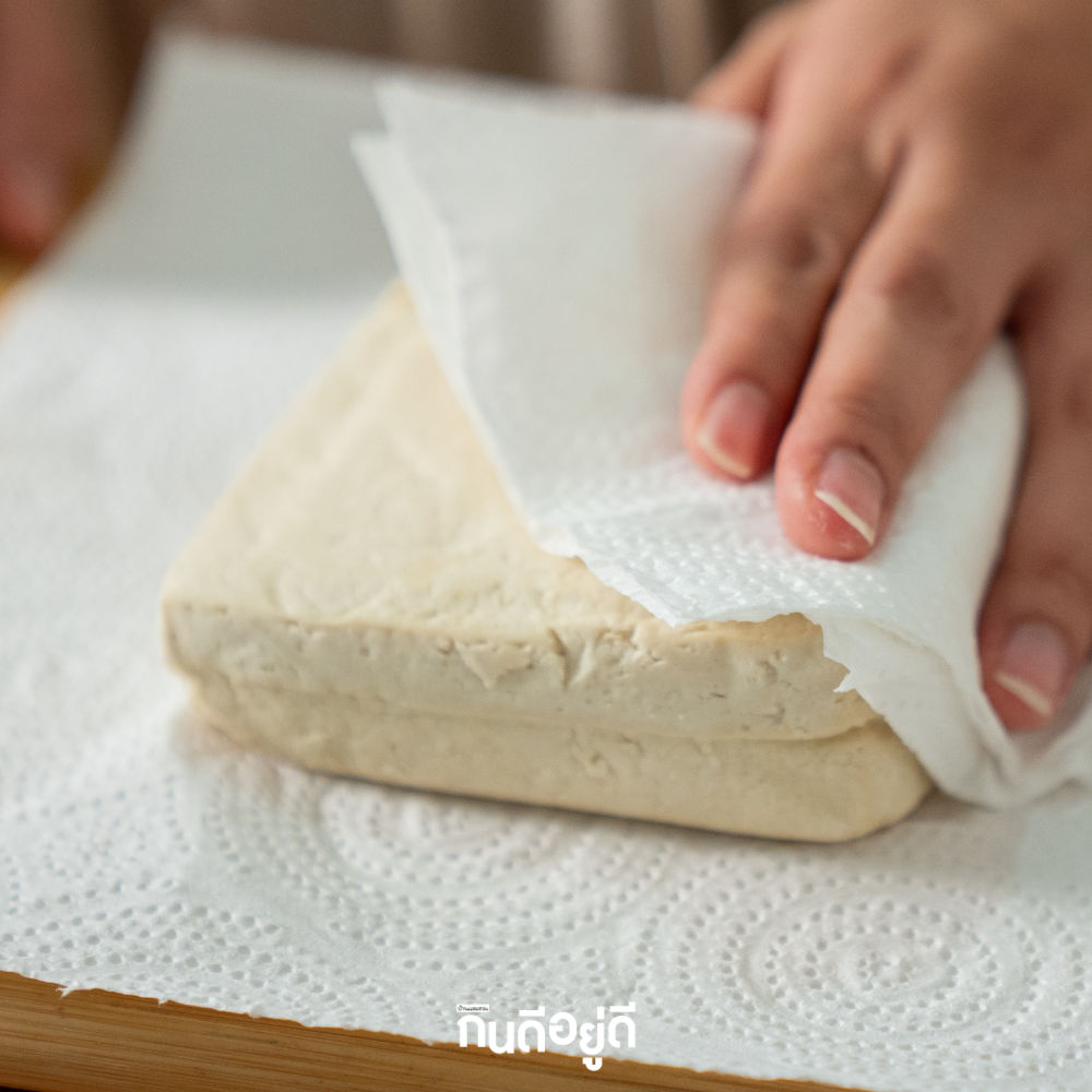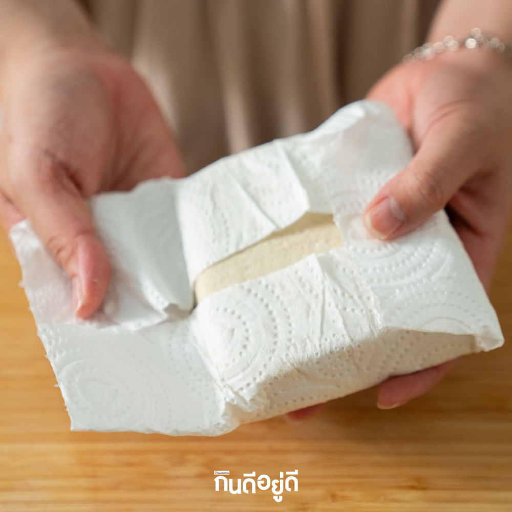 ขั้นตอนแรกเราต้องซับความชื้นที่มีในเต้าหู้ออกก่อน โดยการใช้กระดาษทิชชู่สำหรับทำครัว ซับก้อนเต้าหู้ให้แห้งที่สุด