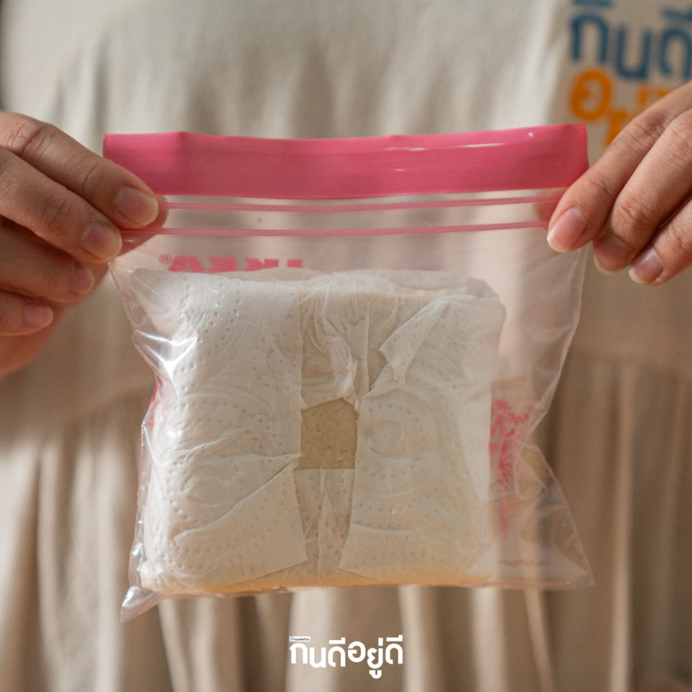 แล้วจับใส่ถุงพลาสติกซิปล็อค รูดปิดปากถุงให้เรียบร้อยแล้วนำไปเก็บในตู้เย็นช่องธรรมดาได้เลยค่ะ