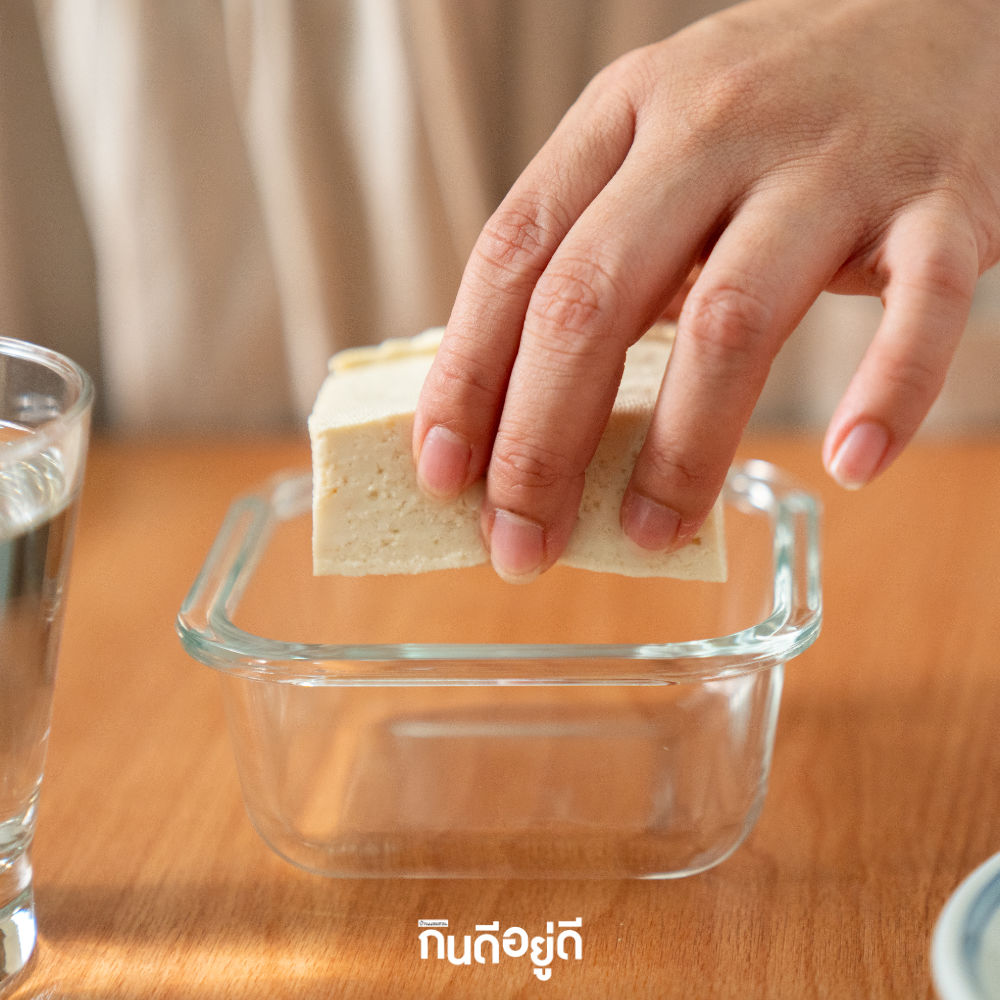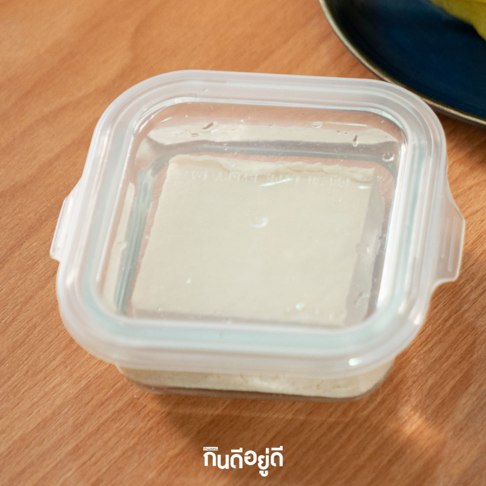 ข้อแรกที่ต้องมีคือกล่องที่มีฝาปิดสนิท จะเป็นกล่องแก้วหรือพลาสติกก็ได้นะคะ ล้างทำความสะอาดให้เรียบร้อยแล้วใส่เต้าหู้ที่ใช้ไม่หมดลงไปได้เลย