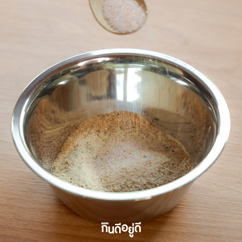 - จากนั้นปรุงรสด้วยเกลือ พริกไทย ผงกระเทียม ตัดรสด้วยน้ำตาลนิดหน่อย ขั้นตอนนี้ใครอยากใส่เครื่องเทศอื่น ๆ ก็ได้นะคะตามความชอบได้เลยค่ะ คลุกเคล้าส่วนผสมต่าง ๆ ให้เข้ากัน