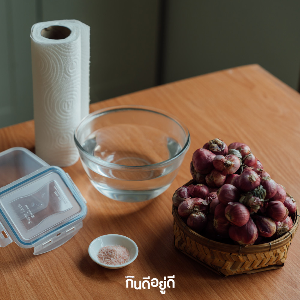ของที่ต้องเตรียมวันนี้ไม่มีอะไรมากเลยค่ะ นอกจากหอมแดงที่เราจะปอก ก็มีภาชนะใส่น้ำอุ่น กระดาษทิชชู่สำหรับทำครัว เกลือ กล่องพลาสติกที่ฝาปิดสนิท มีด เท่านี้ก็เริ่ม ปอกหอมแดง แบบเร็วพิเศษได้แล้ว