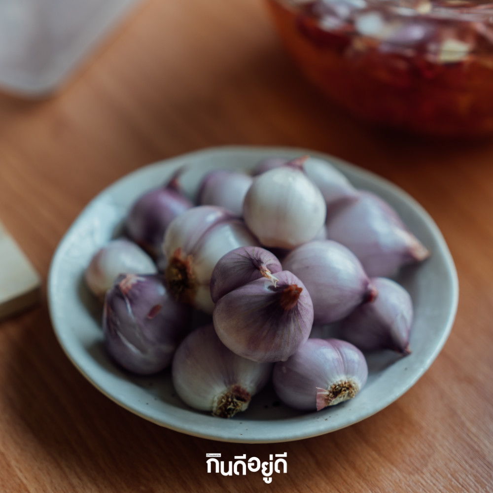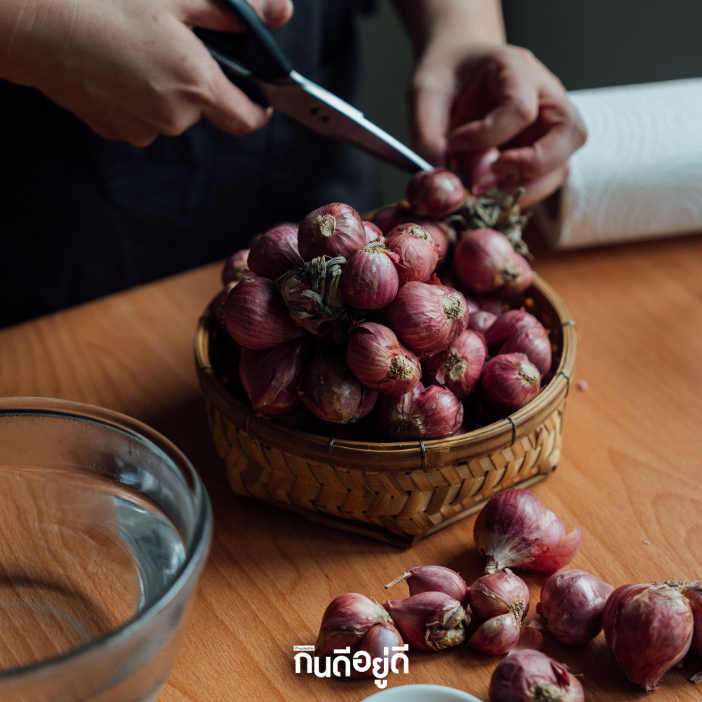 ขั้นตอนแรก แบ่งหอมแดงออกจากพวง หรือ ถ้าบ้านไหนได้แบบเป็นลูกเดี่ยว ๆ มาแล้วก็ดีเลยค่ะ ในระหว่าสงนี้ตรวจเช็คให้ดีลูกไหนมีราดำ หรือลูกไหนเหี่ยว ๆ แล้วคัดออกจากกองได้เลยค่ะ