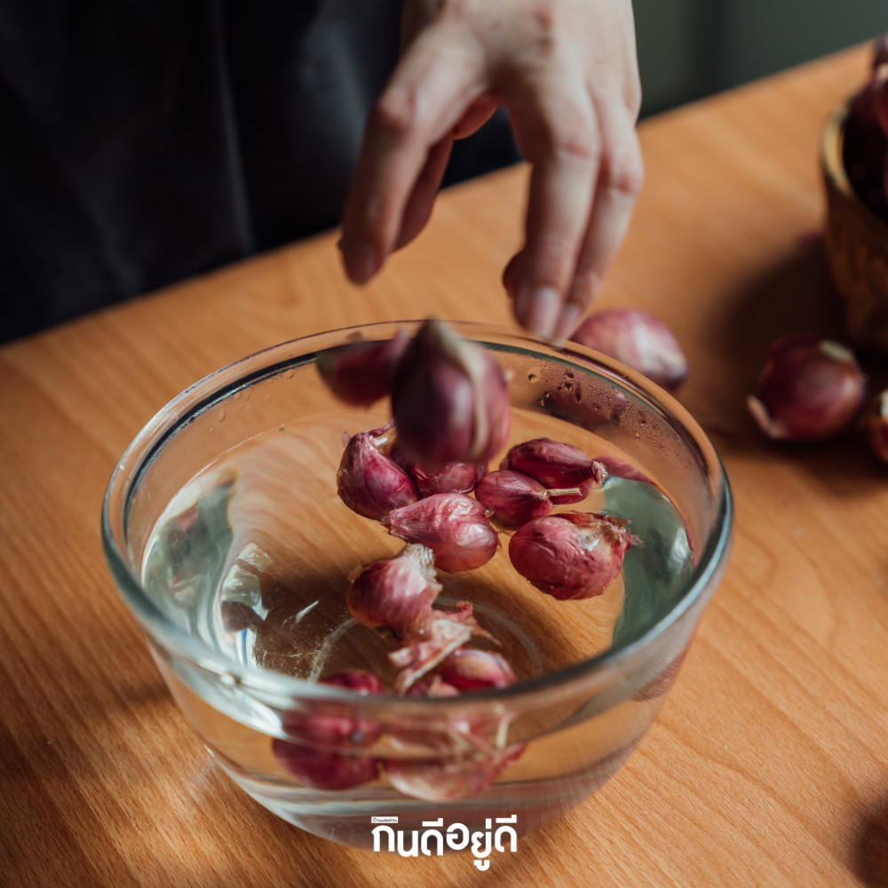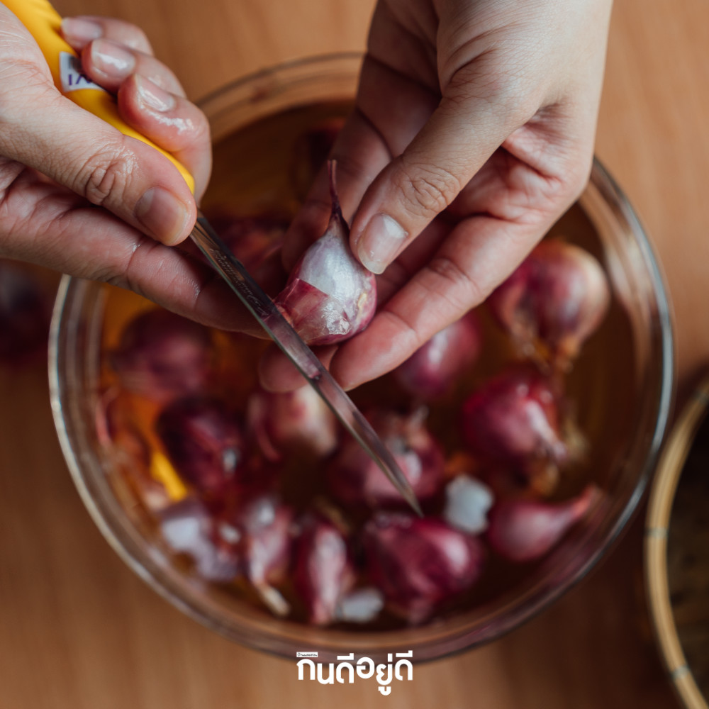 เมื่อครบกำหนดเวลา แล้วนำหอมแดงขึ้นจากน้ำ ใช้มีดปอกเปลือกหอมแดงออกได้เลยแบบง่ายสุด ๆ เพราะได้ผ่าน