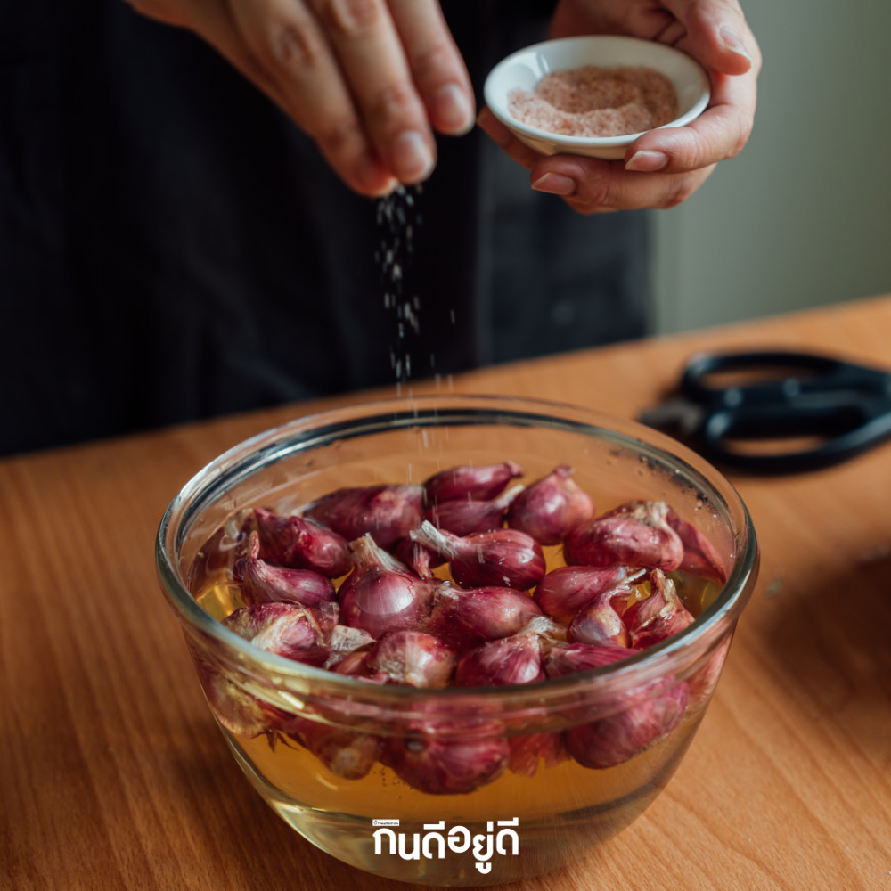จากนั้นเติมเกลือลงไปเล็กน้อย แล้วแช่หอมแดงเอาไว้ประมาณ 5 นาที ทั้งน้ำอุ่นและเกลือจะทำให้เปลือกหอมแดงอ่อนตัว และปอกง่ายขึ้น