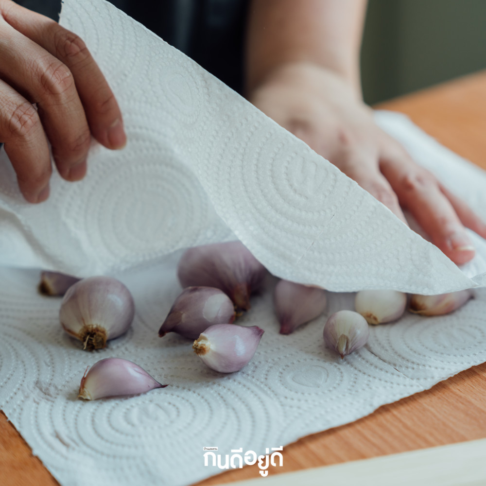 ส่วนถ้าใครที่อยากเก็บหอมแดงที่ปอกเปลือกเรียบร้อยแล้ว ไว้ใช้ต่อแบบที่ขึ้นรา แนะนำให้เก็บต่อด้วยวิธีเลยค่ะ ก่อนอื่นต้องใช้กระดาษทิชชู่สำหรับทำครัวซับความชื้นออกจากหอมแดงให้หมดเกลี้ยงซะก่อน เพราะเมื่อซักครู่นี้เราเอาเค้าไปแช่น้ำมา