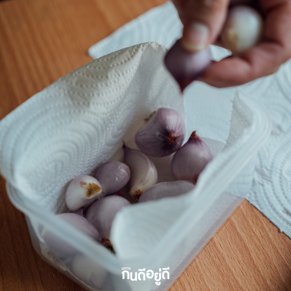 จากนั้นหากล่องพลาสติกที่มีฝาปิดสนิท รองก้นกล่องด้วยกระดาษทิชชู่สำสหรับทำครัว 1 ชั้น แล้วจึงใส่หอมแดงที่ซับจนแห้งแล้วตามลงไป