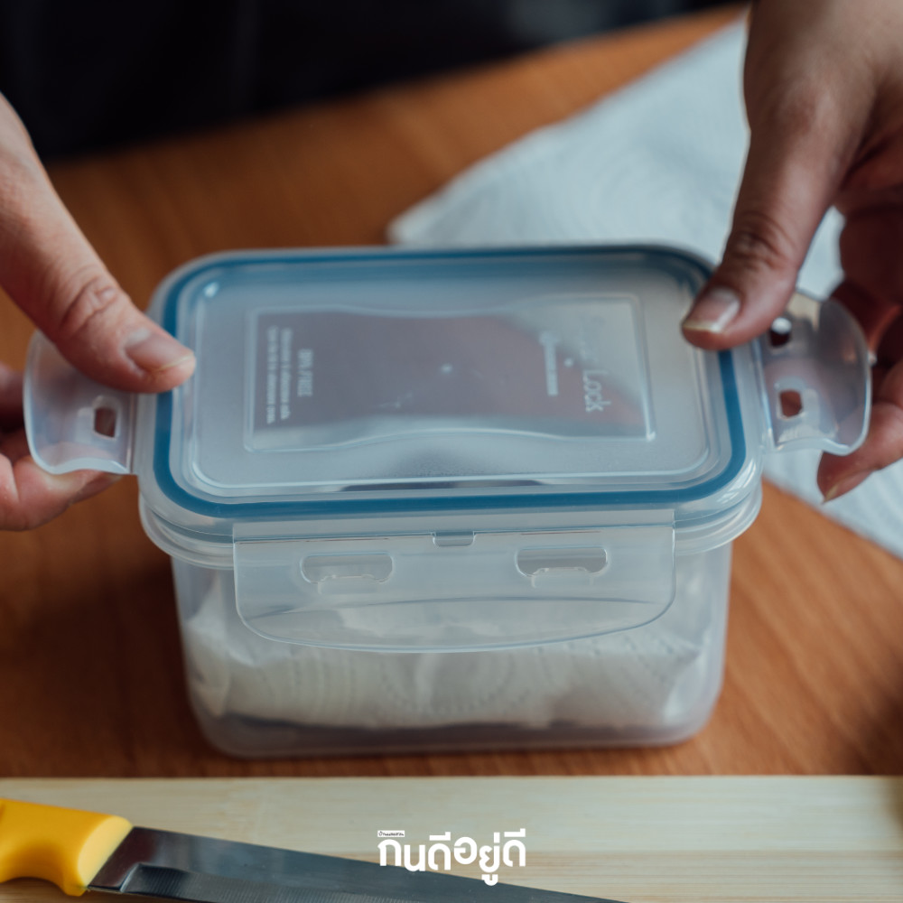 ปิดหน้าอีกชั้นด้วยกระดาษทิชชู่สำหรับทำครัวอีกทีแล้วค่อยปิดฝา นำไปแช่ในตู้เย็นช่องธรรมดาได้เลยค่ะ วิธีการเก็บหอมแดงแบบนี้จะทำให้หอมแดงอยู่ต่อได้นานแบบที่เชื้อราไม่มาทักทาย