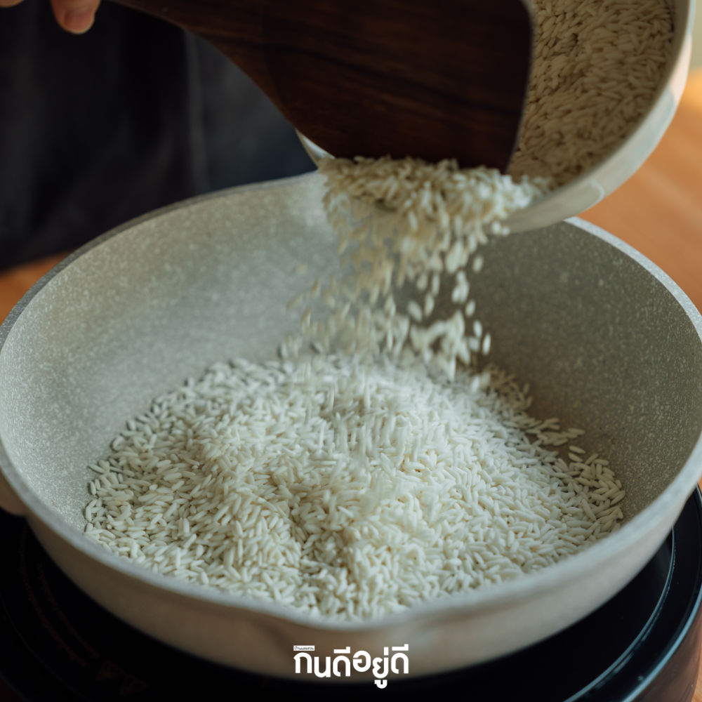 ขั้นตอนแรกตั้งกระทะ ใช้ไฟอ่อนวอร์มให้กระทะอุ่น ๆ แล้วใส่ข้าวเหนียวเขี้ยวงูลงไปได้เลย ตามด้วนสมุนไพรที่เราเตรียมไว้