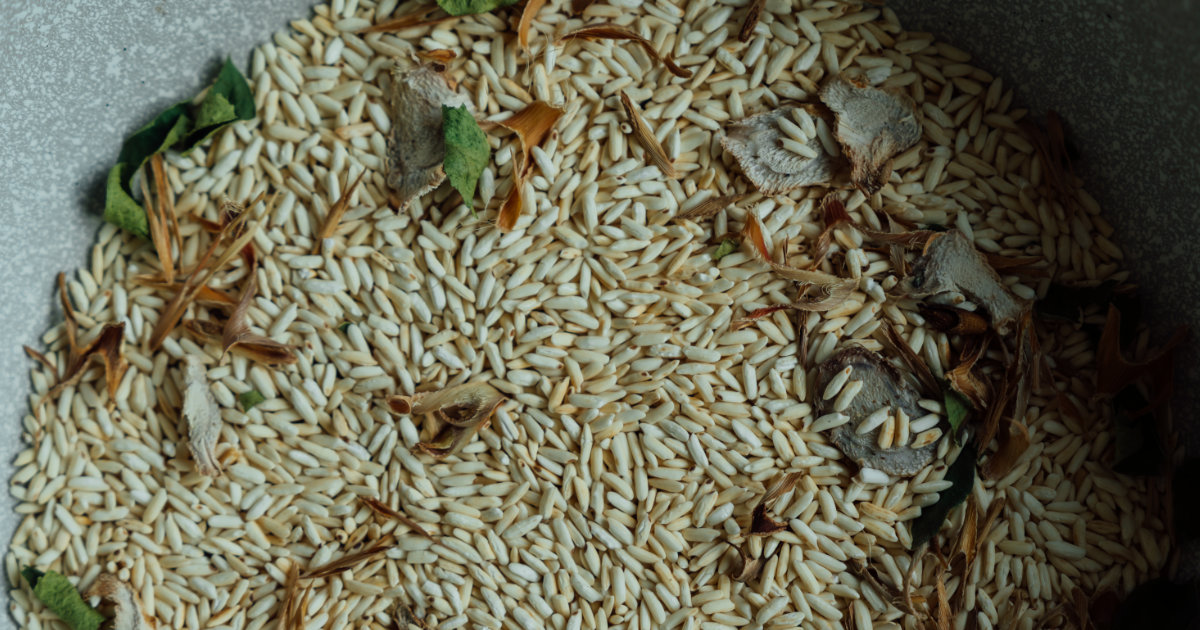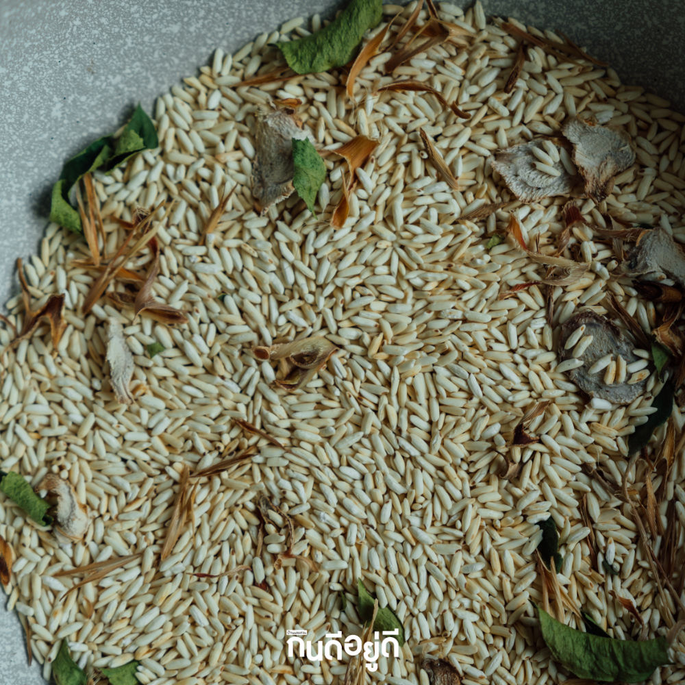 หลังจากนี้ก็หมั่นคั่วไปเรื่อย ๆ จนข้าวเหนียวเริ่มเปลี่ยนสีเป็นสีน้ำตาล สมุนไพรที่เราใส่ไว้เริ่มแห้งจนกรอบ และเมื่อส่วนผสมทั้งหมดเริ่มส่งกลิ่นหอมก็ยกลงจากเตา