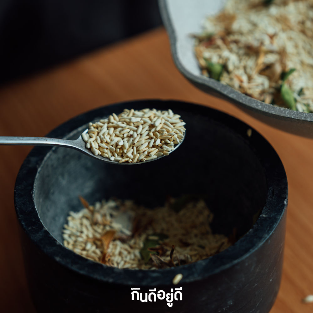 หากใช้การตำ ใช้สากค่อย ๆ บดเมล็ดข้าวมให้แตกออกก่อน ค่อยออกแรงตำ ใช้มือป้องไว้กันข้าวคั่วกระเด็นกระดอนออกนอกครกด้วยนะ