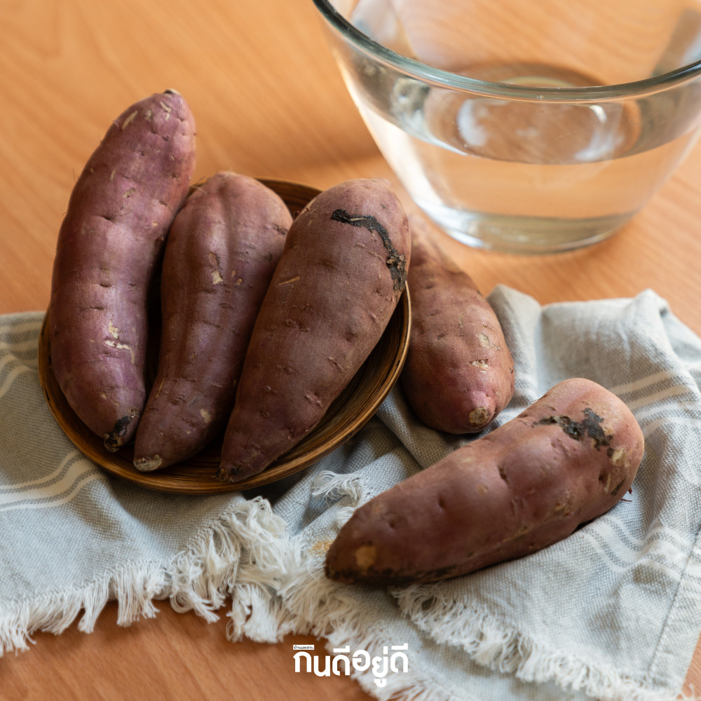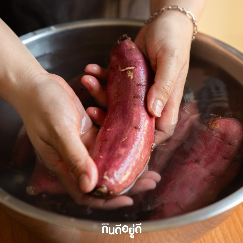 ขั้นตอนแรกเอาหัวมันที่ซื้อมา ล้างทำความสะอาดผิวด้านนอกให้สะอาดกริ๊บ ใช้นิ้วถูเอาพวกเศษดิน คราบสกปรกที่ติดอยู่ตามผิวและตาเล็ก ๆ ตรงนั้นออกให้หมดนะคะ
