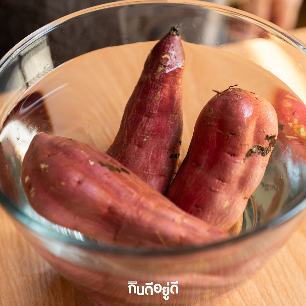 เมื่อล้างทำความสะอาดหัวมันทั้งหมดแล้ว เตรียมน้ำสะอาดใส่ภาชนะอีกใบ แช่หัวมันที่สะอาดสะอ้านลงในน้ำได้เลยค่ะ แช่ทิ้งไว้ประมาณ 30 – 45 นาที ให้หัวมันค่อย ๆ ดูดน้ำเข้าไปถึงด้านในของเนื้อ