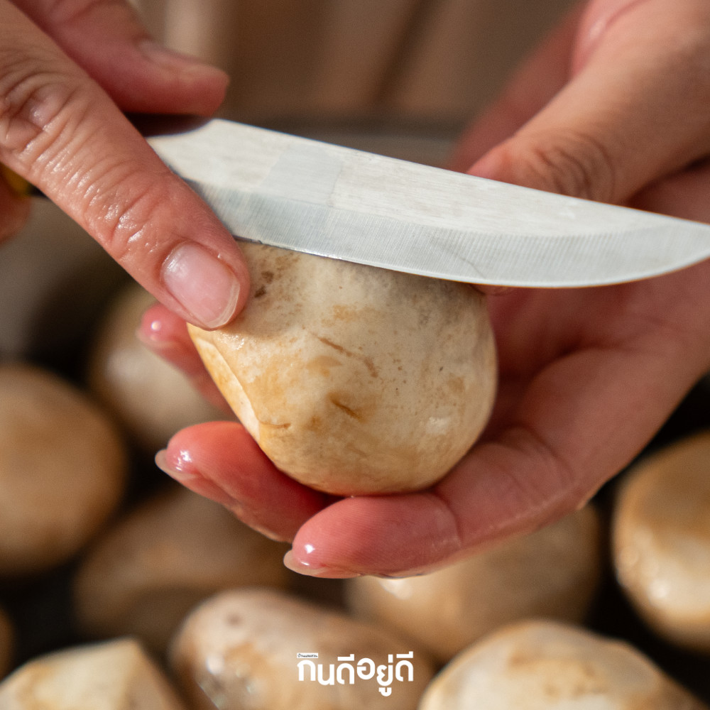 3. ใช้มีดผ่าแบ่งครึ่งเห็ดฟางทั้งหมดที่ล้างทำความสะอาดเมื่อซักครู่นี้