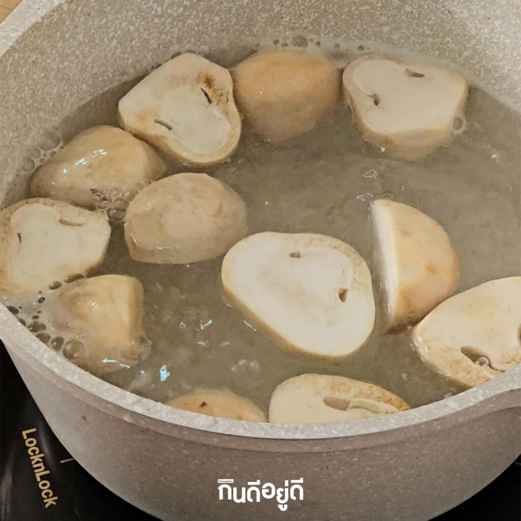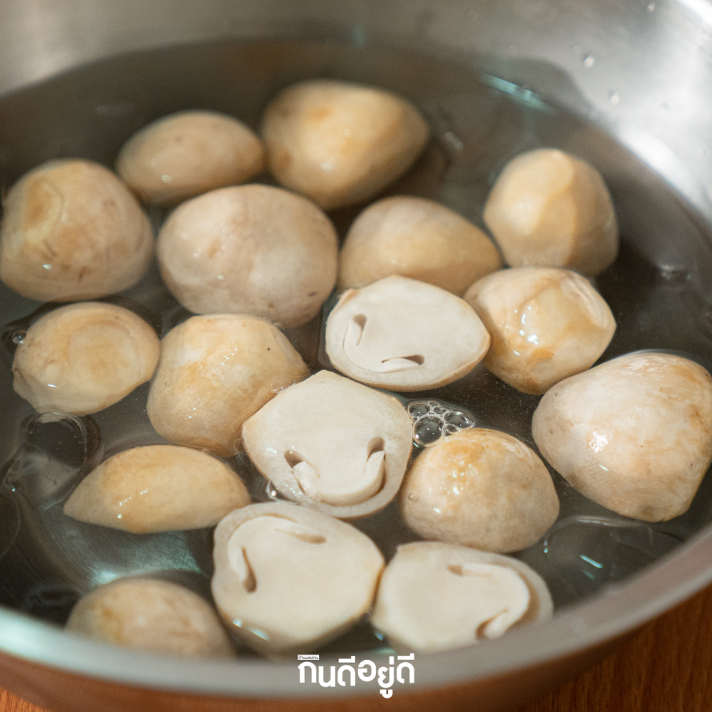 4 . ใส่น้ำในหม้อ ตั้งไฟให้น้ำเดือดปุด ๆ ก่อนจะใส่เห็ดฟางทั้งหมดลงไปลวกให้พอสุก