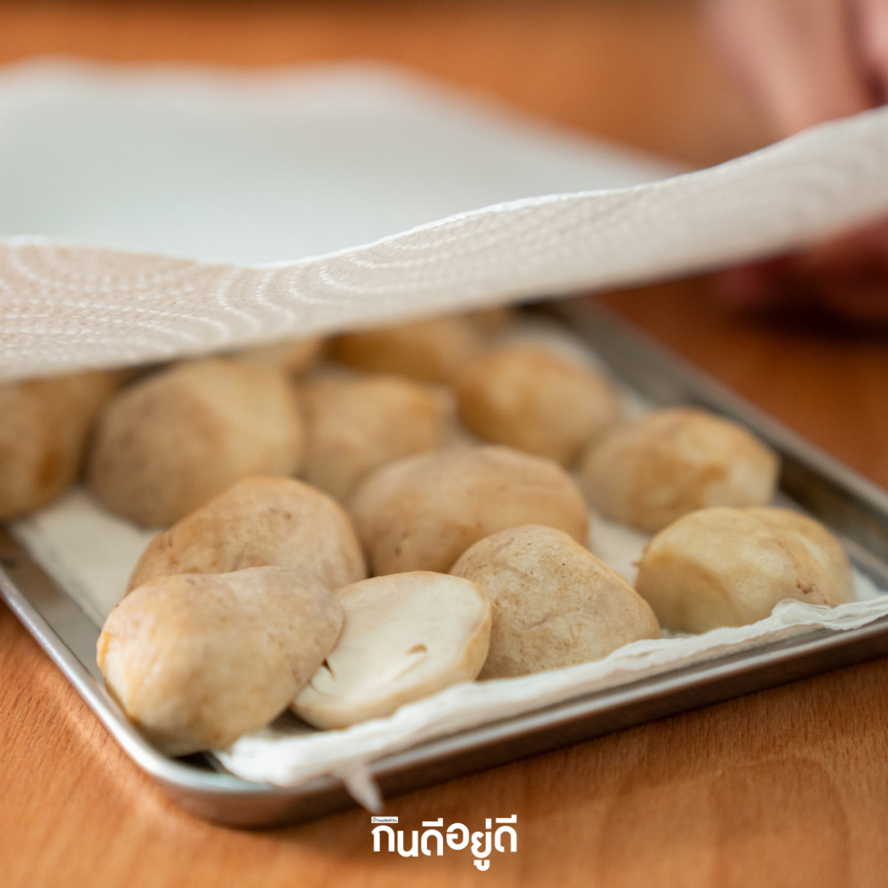 6 . เมื่อเห็ดฟางเย็นตัวลงแล้ว ช้อนขึ้นจากน้ำ มาซับให้แห้งด้วยกระดาษทิชชู่สำหรับทำครัว